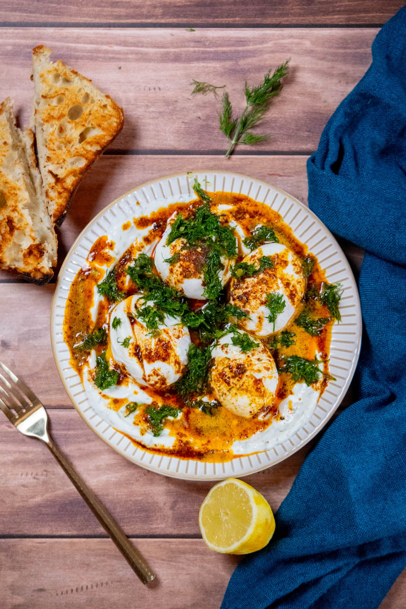 With all that tangy garlic yogurt, runny poached eggs, and fresh dill, this dish is practically begging for some bread to soak up all that goodness!