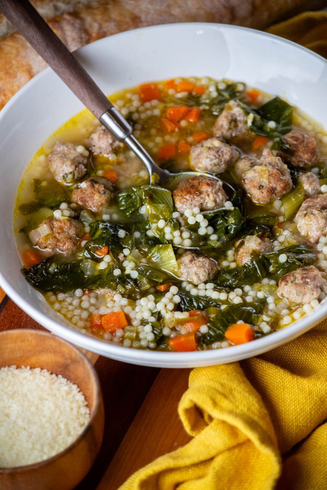 Acini de peppe pasta. Italian for "seeds of pepper", this tiny bead-like pasta is a classic shape for Italian Wedding Soup. For the best broth consistency, I highly recommend cooking the pasta separately, then adding to each bowl before serving. You can also add it right to the pot, but you may need to add a bit of water to warm up leftovers, as the pasta tends to soak up a lot of the broth.